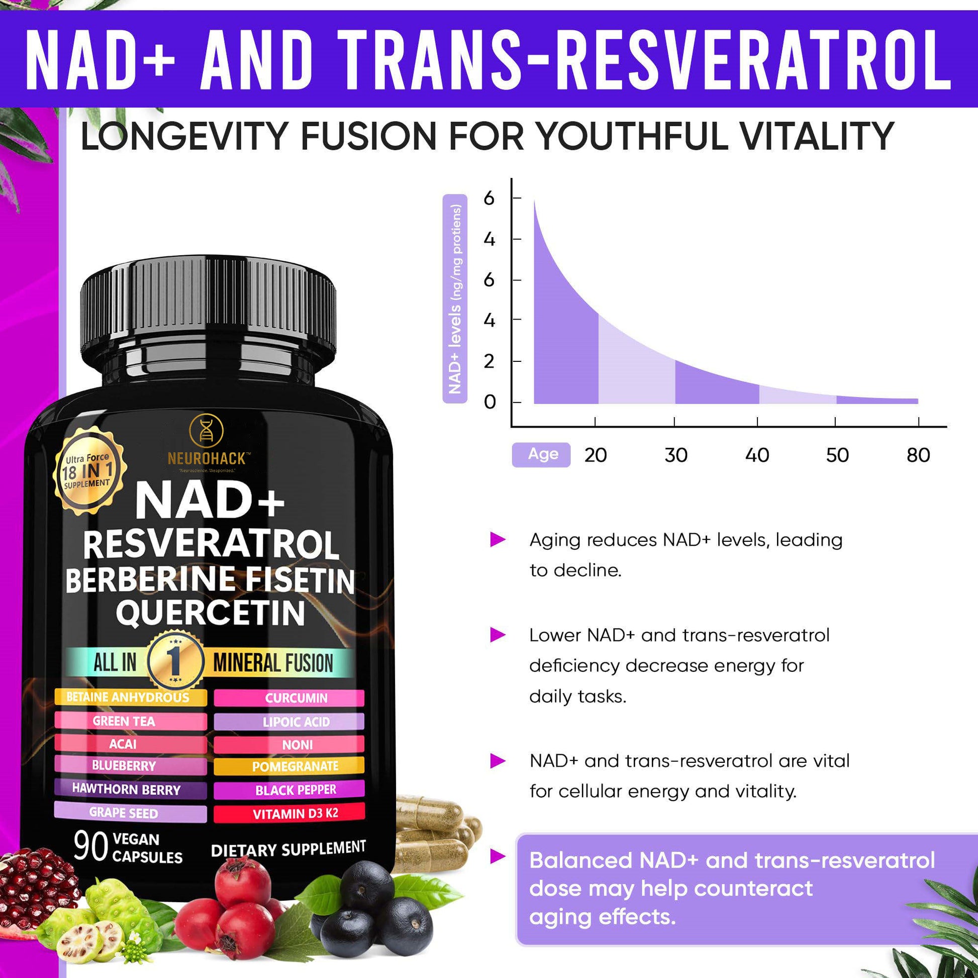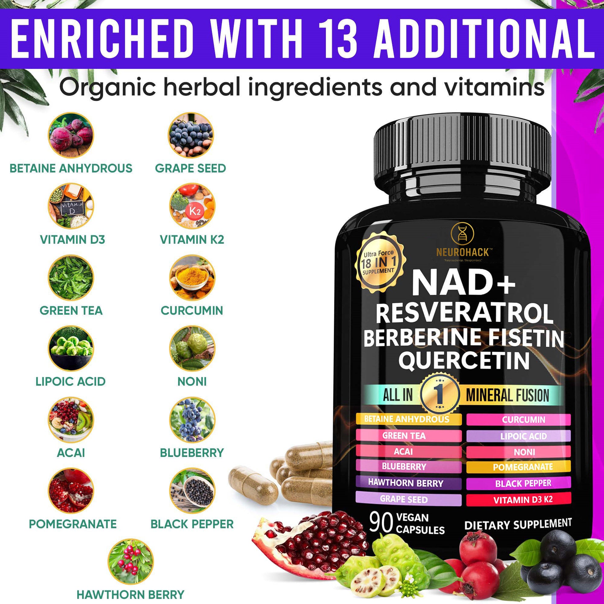Neurohack is proud to introduce the breakthrough liposomal NAD Resveratrol Berberine mineral fusion, made with NAD+ and Resveratrol, NAD+ Resveratrol-Berberine-Quercetin 18-IN-1 Mineral Fusion: containing a total of 18 active ingredients in one powerful blend to help support cellular health, cardiovascular function, endurance, and healthy ageing. This supplement (1000 mg pure organic comprehensive formula) includes NAD+, Resveratrol, Berberine, Betaine Anhydrous, Grape Seed Extract, Vitamin K2, Vitamin D3, Green Tea, Curcumin, Ficetin, Alpha Lipoic Acid, Noni, Acai, Blueberry, Pomegranate, Hawthorn, and Black Pepper. Designed for universal health, our NAD+ Resveratrol Berberine Fusion provides a holistic solution for healthy ageing and overall well-being. Containing a variety of ingredients such as berberine, flavin, and quercetin, it addresses a variety of health needs and is suitable for a wide range of people. These pure organic resveratrol capsules are a great alternative to standalone supplements like resveratrol, berberine, quercetin, fisetin, and curcum