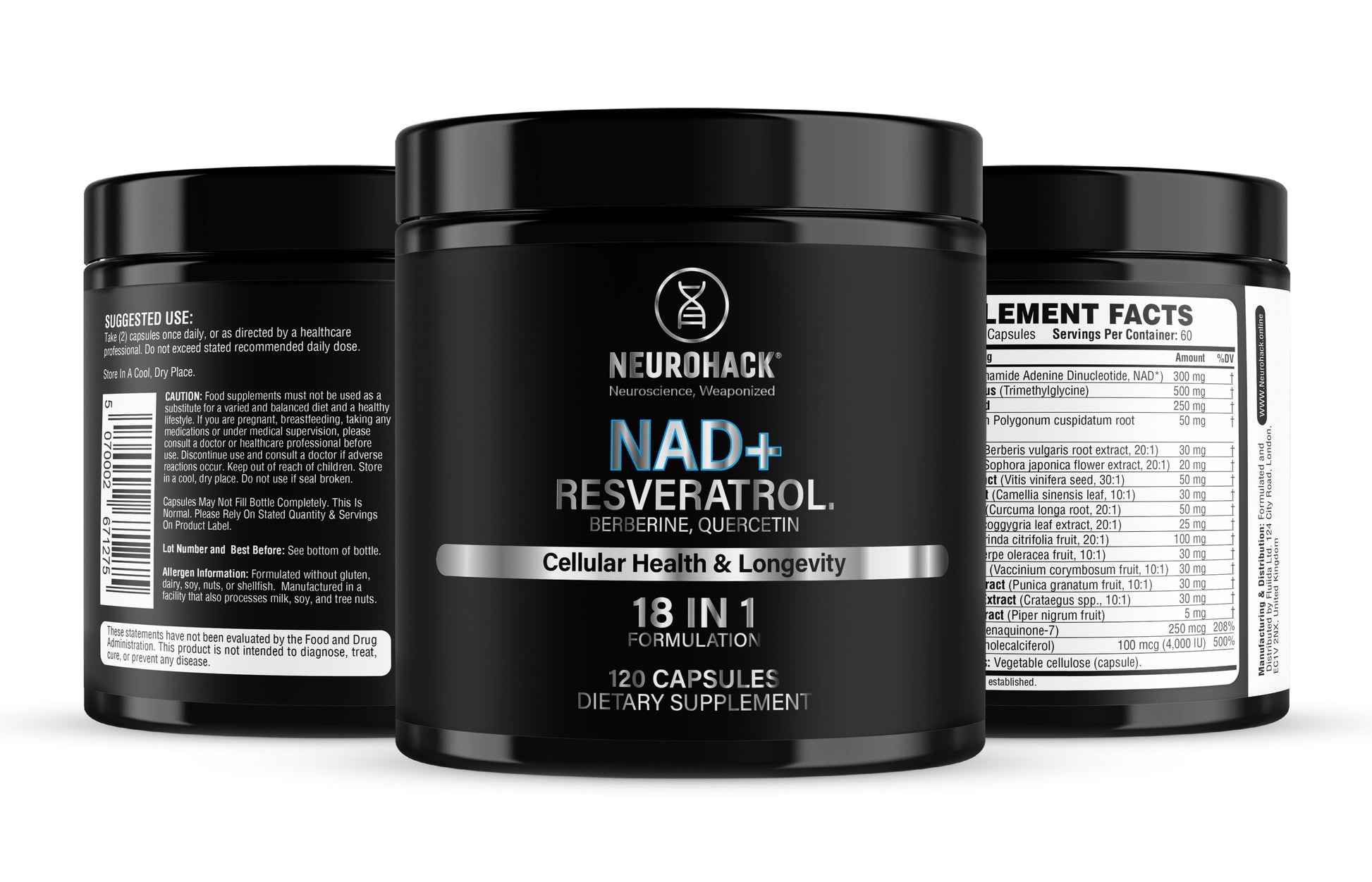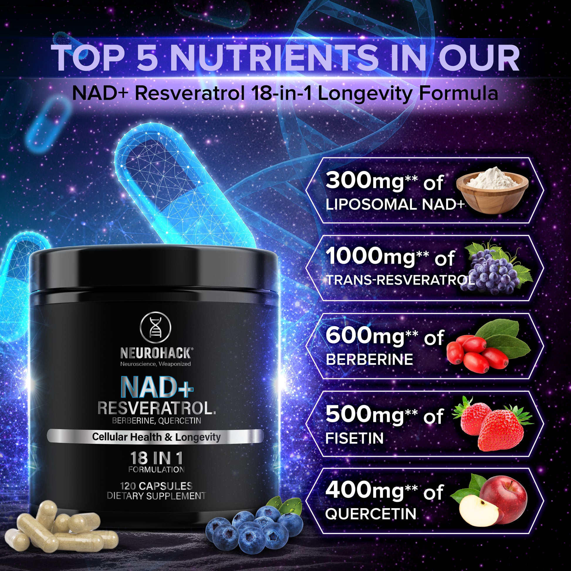 NAD+ (Nicotinamide Adenine Dinucleotide) – 300mg Resveratrol (Polygonum cuspidatum 20:1 Extract)[Root][Equivalent to 1000mg of raw Resveratrol powder] – 50mg Quercetin (Sophora japonica 20:1 Extract)[Flower][Equivalent to 400mg of raw Quercetin powder] – 20mg Betaine Anhydrous (Trimethylglycine (TMG) Powder) – 500mg Grape Seed Extract (Vitis vinifera 30:1 Extract)[Seed][Equivalent to 1500mg of raw Grape Seed powder] – 50mg Vitamin K2 (Menaquinone-7) – 250mcg Vitamin D3 (Cholecalciferol)[Equivalent to 4000 IU] – 100mcg Green Tea (Camellia sinensis 10:1 Extract)[Leaf][Equivalent to 300mg of raw Green Tea powder] – 30mg Curcumin (Curcuma longa 20:1 Extract)[Root][Equivalent to 1000mg of raw Curcumin powder] – 50mg Fisetin (Cotinus coggygria 20:1 Extract)[Leaf][Equivalent to 500mg of raw Fisetin powder] – 25mg Lipoic Acid (Alpha-Lipoic Acid) – 250mg Noni (Morinda citrifolia 20:1 Extract)[Fruit][Equivalent to 2000mg of raw Noni powder] – 100mg Acai (Euterpe oleracea 10:1 Extract)[Fruit][Equivalent to 300mg of raw Acai powder] – 30mg Blueberry (Vaccinium corymbosum 10:1 Extract)[Fruit][Equivalent to 300mg of raw Blueberry powder] – 30mg Pomegranate (Punica granatum 10:1 Extract)[Fruit][Equivalent to 300mg of raw Pomegranate powder] – 30mg Hawthorn Berry (Crataegus 10:1 Extract)[Berry][Equivalent to 300mg of raw Hawthorn Berry powder] – 30mg Hawthorn Berry (Crataegus 10:1 Extract)[Berry][Equivalent to 300mg of raw Hawthorn Berry powder] – 5mg